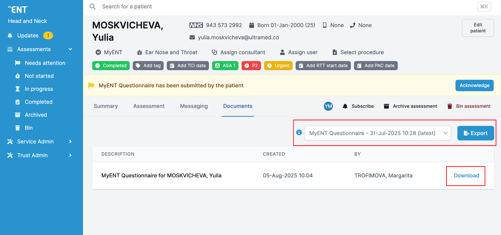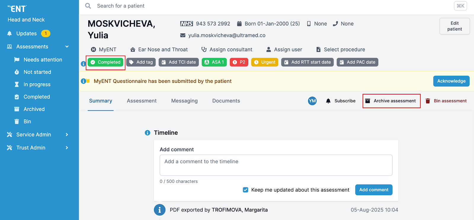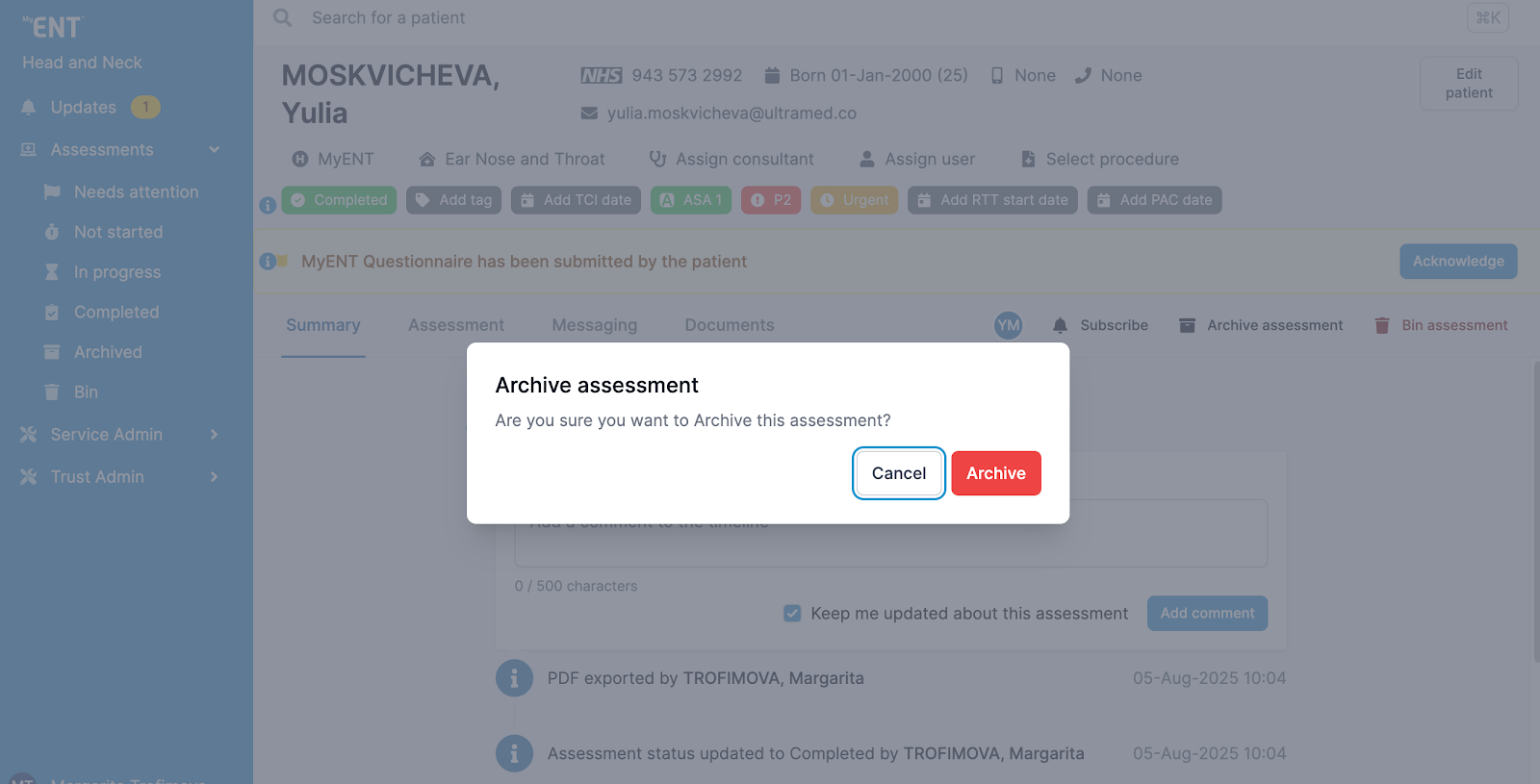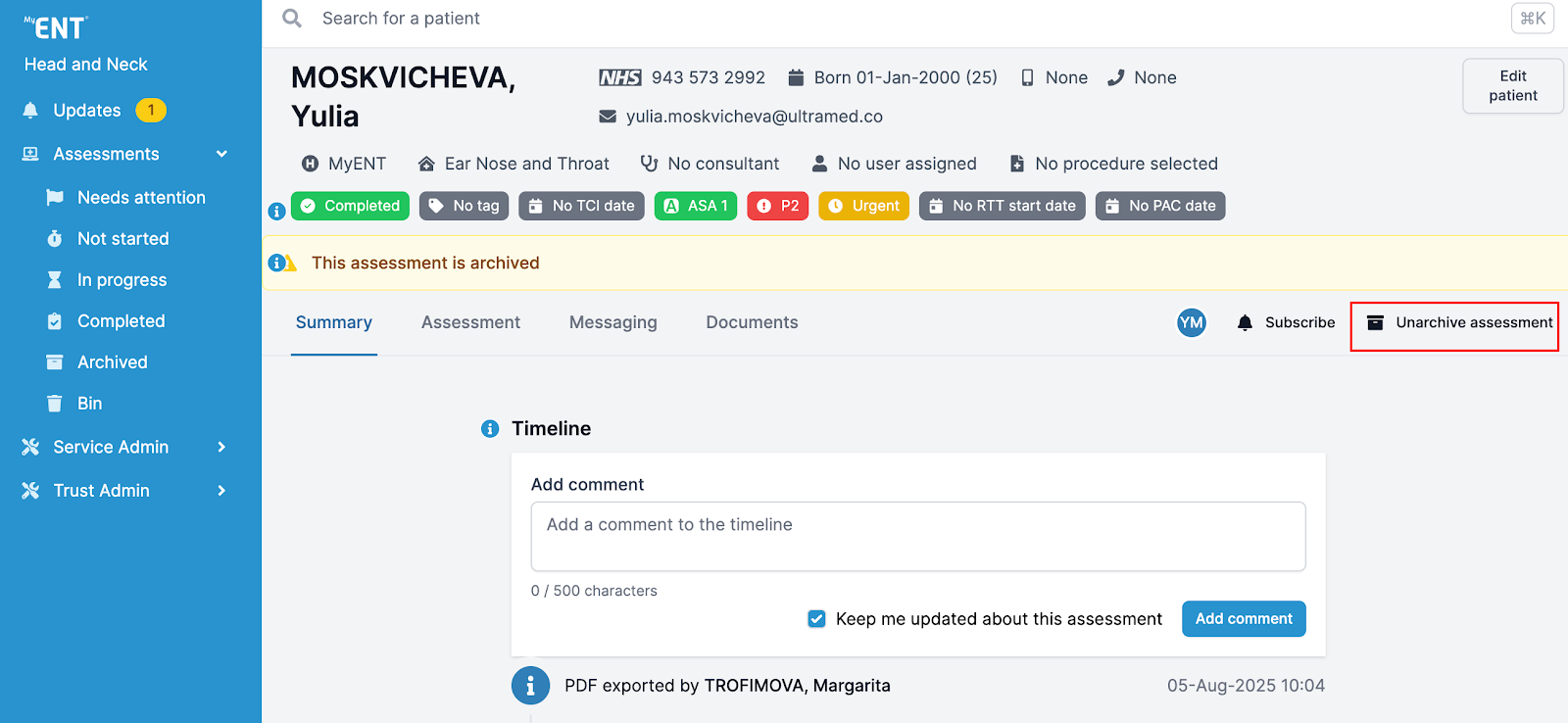 • To unarchive an assessment, open the patient in the ‘Archived’ folder.