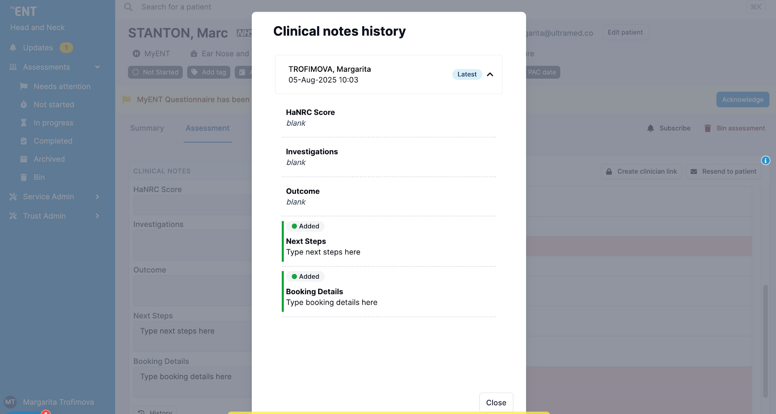 • Changes are always compared to the most recent previous form, not the original. For example, if the patient has three submissions, the changes in the third(most recent) form will appear against the second form, and changes in the second form will highlight changes against the first form. This ensures you always see what has changed since the last review.