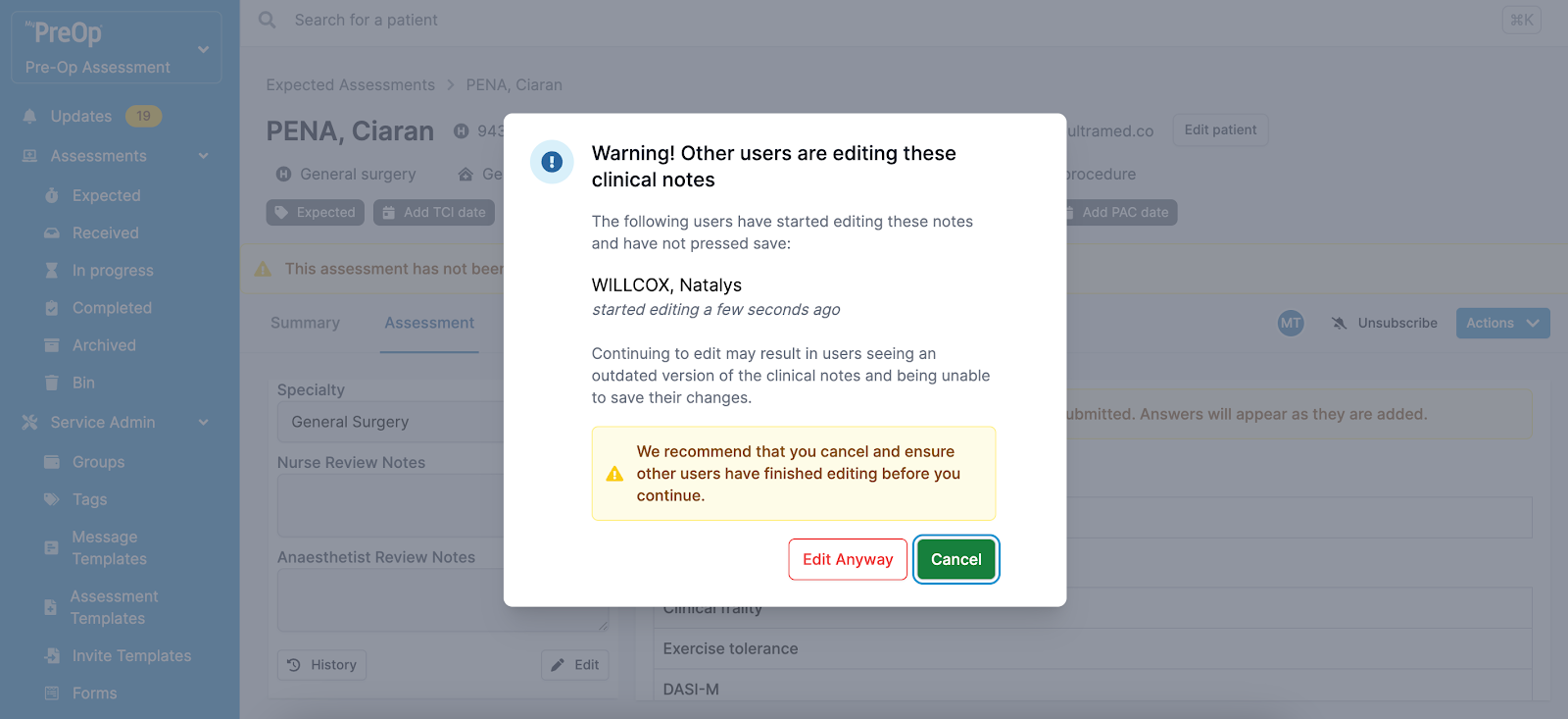 When multiple users edit the Clinical Notes at the same time, the system will warn you before saving.