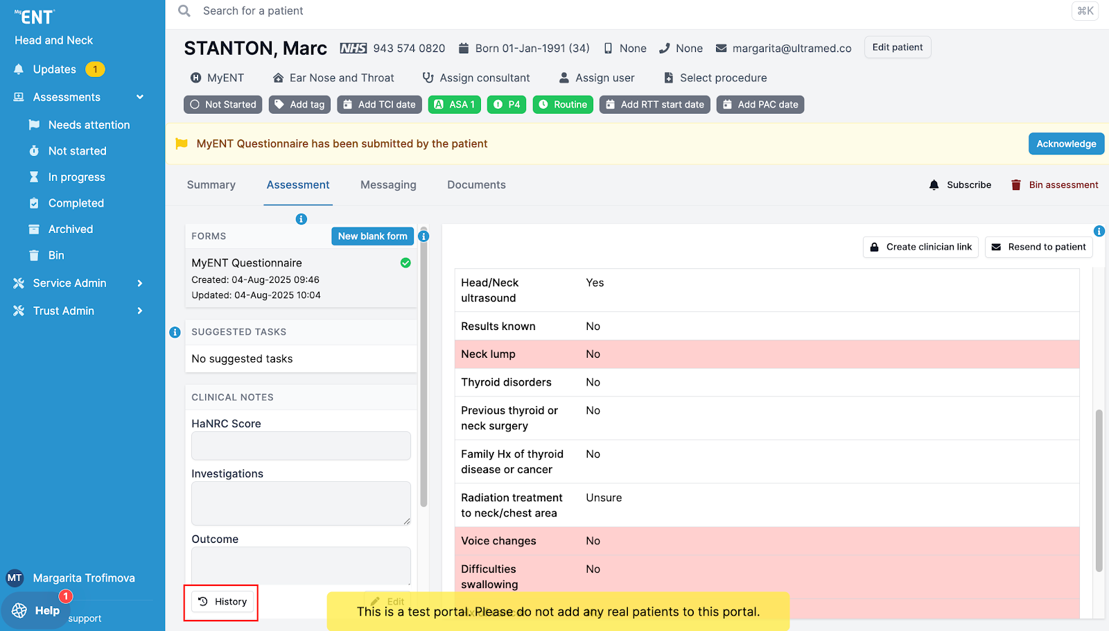 Click the “History” button (bottom left of the Clinical Notes section) to: