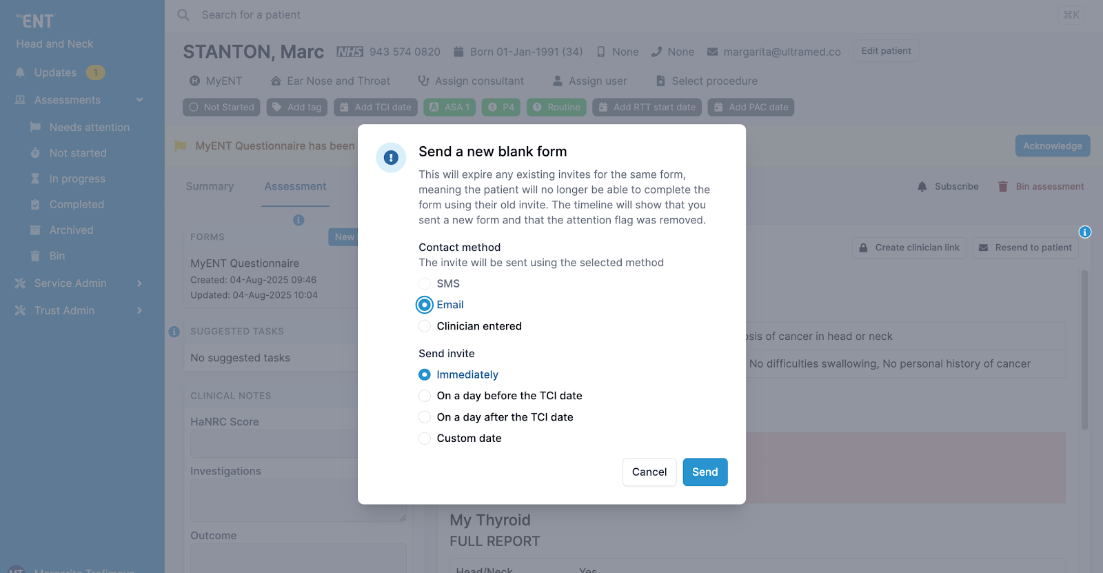 To complete a form on behalf of a patient, choose “Clinician entered” as the contact method.