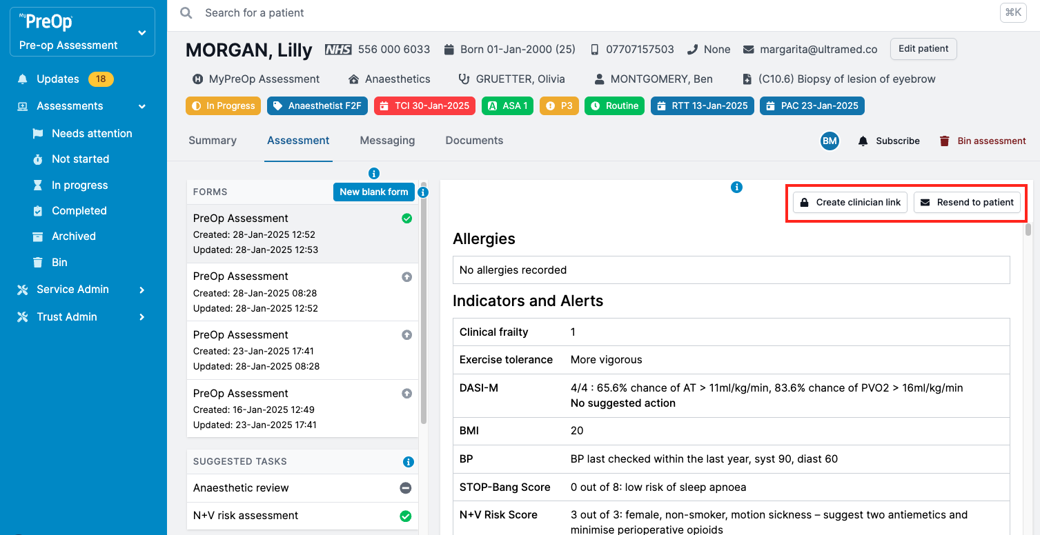 • Create clinician link – Allows a clinician to access and edit the patient’s existing answer
