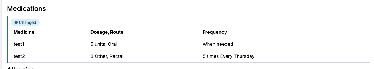 • Some sections are highlighted as a whole, rather than showing changes to individual items. For example, if any medication is added, removed, or updated, the entire Medications section will be highlighted.