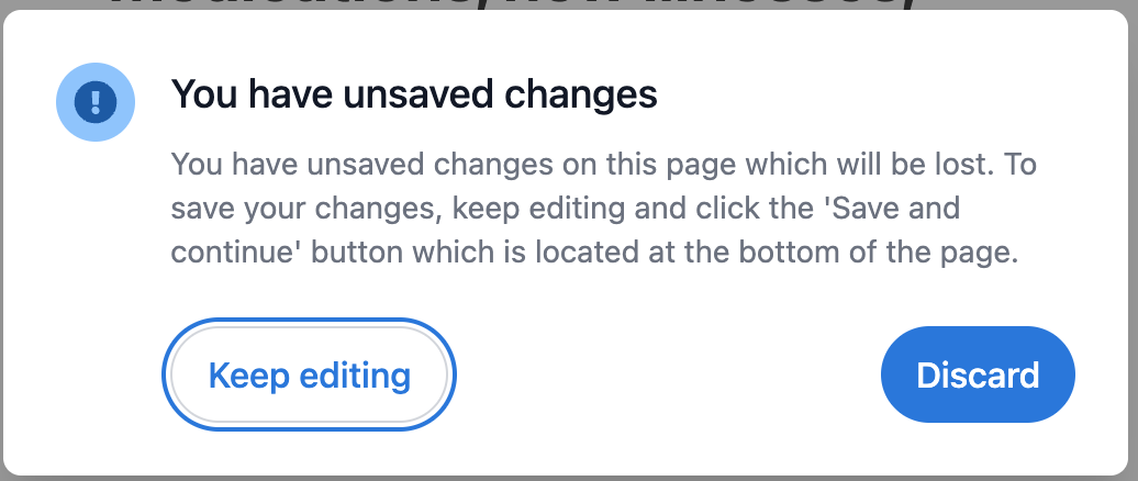 A small platform-wide improvement to the patient app, which adds a dialog to prompt the patient to save their answers on the page if they navigate away before saving.
